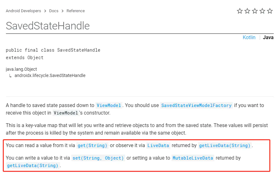 SavedStateHandle提供了对LiveData的存取支持。`SavedStateHandle`对`LiveData`的支持,来自对`LiveData`的内部的静态包装类`SavingStateLiveData`。 `SavingStateLiveData`包装了`setValue()`,传入的参数会被优先储存到`mRegular`中。