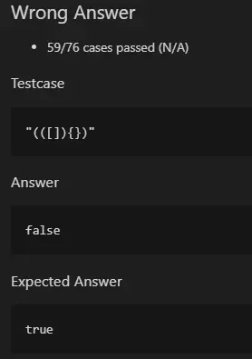 这个解法是针对所有给到的测试用例至少都会有一组紧挨对称的括号(如[{}])。那每一次循环将紧挨对称的括号去除掉,到最后理想的情况就如官方解法一样,没有剩下的括号元素。