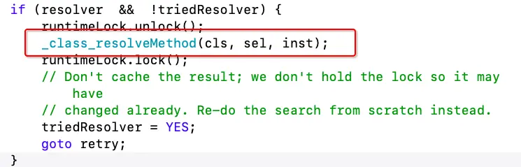 _class_resolveMethod方法后,在进行一次retry,重新进行一遍方法的查找流程,而只有一次动态方法解析的机会就是在_class_resolveMethod方法中。