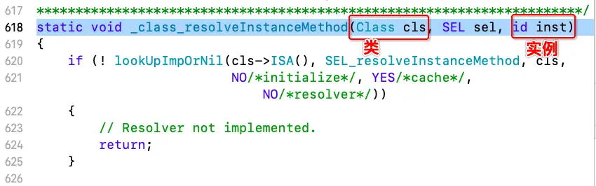 static void _class_resolveInstanceMethod(Class cls, SEL sel, id inst)