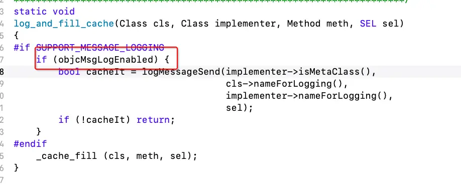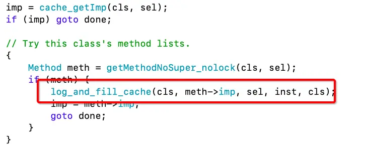 lookUpImpOrForward源码,如上图,当查找到IMP时,会调用log_and_fill_cache方法,进行缓存填充和日志存储。