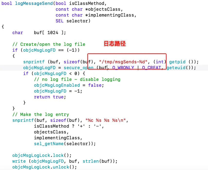 log_and_fill_cache如上图,通过控制objcMsgLogEnabled来控制日志存储,日志会记录在/tmp/msgSends目录下,而objcMsgLogEnabled的赋值是在instrumentObjcMessageSends之中,可以暴露这个方法,来达到外部打日志的操作。