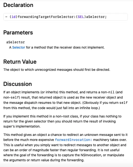 通过查看forwardingTargetForSelector的官方文档,