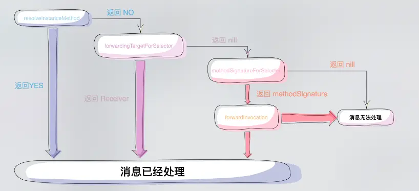 IMP时,没有找到时,进入方法动态解析时,会第一次调用resolveInstanceMethod - 然后进入消息转发流程,调用