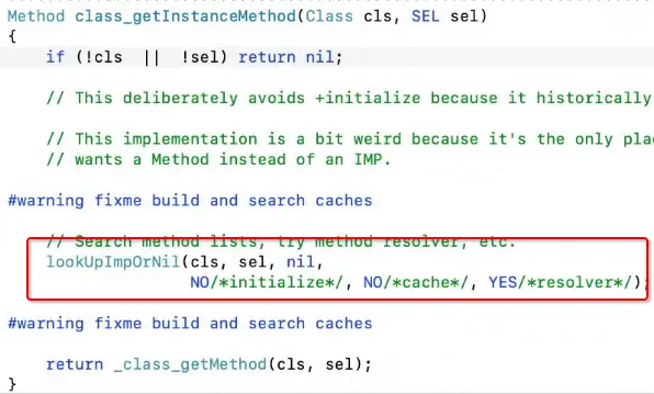 if (! lookUpImpOrNil(cls->ISA(), SEL_resolveInstanceMethod, cls,
