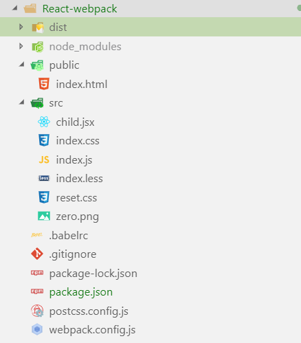 ReactDom.render(<App /> ,document.getElementById('root'))在src目录下添加child.jsx文件,reset.css文件,index.less文件,zero.png图片