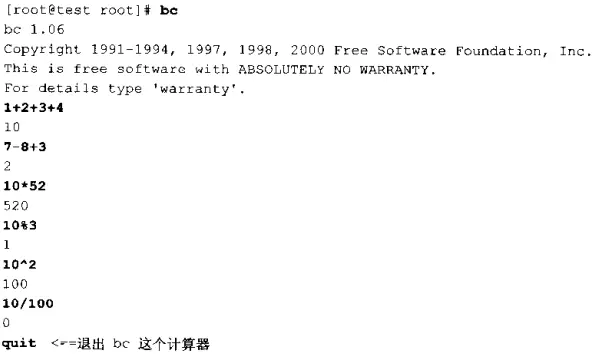 - bc:计算器;默认仅输出整数,如果要输出小数点后的位数,必须执行scale=number,这里的number就是小数点位数。