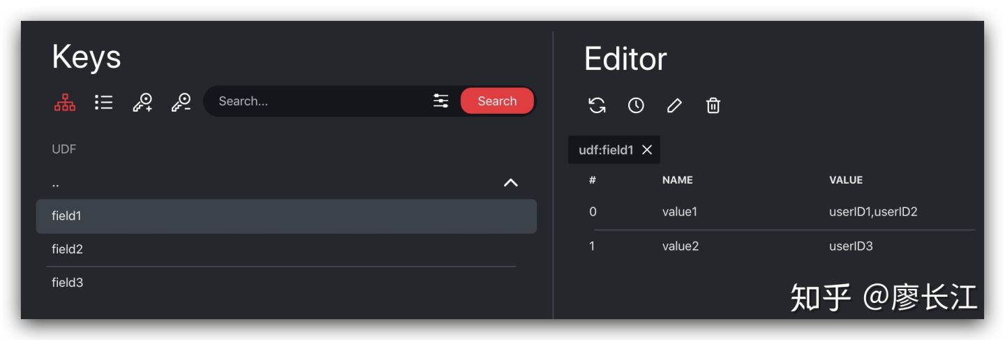 一个用户自定义字段(User Defined Field,简称 udf)在 redis 存储的 key 格式为:udf:filedName,如下图所示: