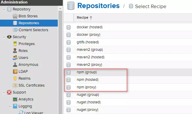 点击在左侧菜单Repositories,可以看到仓库类型列表,如下: