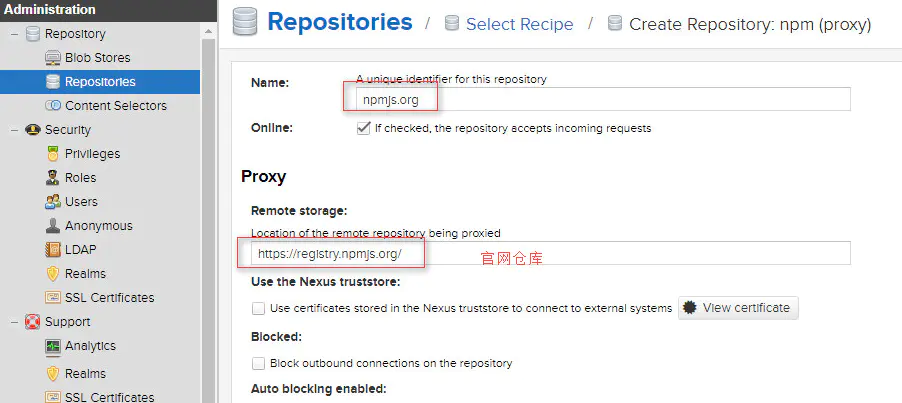 - 选择 npm(proxy), 输入 Name: npm-proxy, remote storage 填写 registry.npm.taobao.org 或 registry.npmjs.org. 用于将包情求代理到地址地址