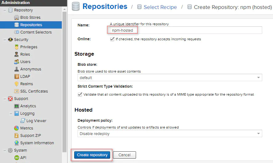 - 再次点击Create repository按钮., 增加 npm(hosted) 输入 Name: npm-hosted 用于存放自己的私有包