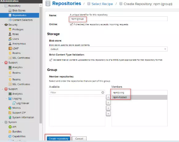 - 再次点击Create repository按钮.,增加npm(group) 输入 Name: npm-all, 下面Member repositories里选择之前添加的2个移动右边