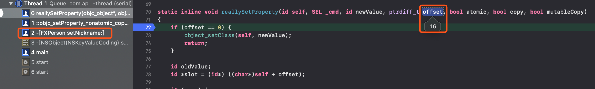 nickname赋值时,此时的内存偏移量为16,刚好偏移isa、name所占内存(8+8)来到nickname