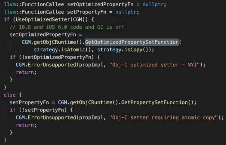 于是乎苹果开发者们就运用通用原则给所有属性都提供了同一个入口——objc-accessors.mm中setter方法根据修饰符不同调用不同方法,最后统一调用reallySetProperty方法