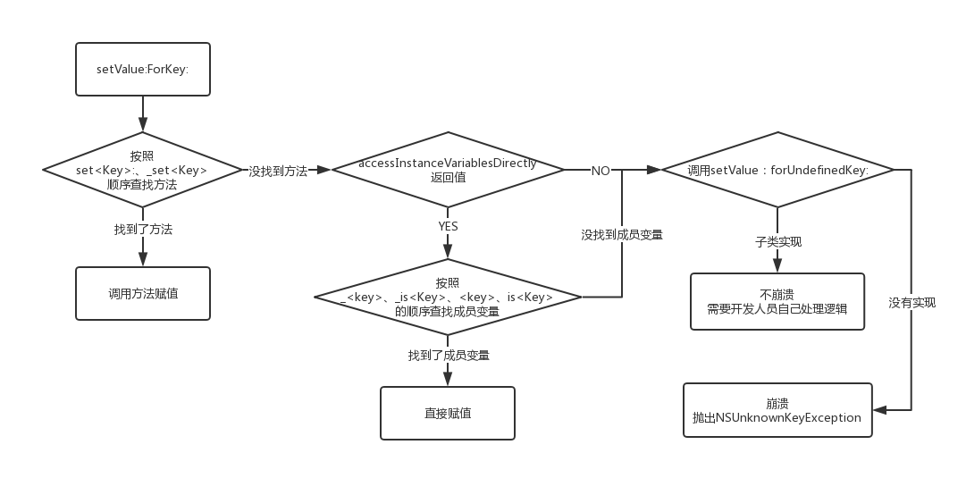 在这里笔者存在一个疑问:没有实现setValue:forUndefinedKey:时,当前类可以响应respondsToSelector这个方法,但是直接performSelector会崩溃,所以改用了判断IMP是否为空