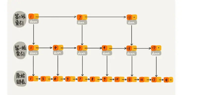 跳表是一种动态的数据结构,它基于有序链表然后在链表的基础上增加了索引层,从而达到快速查找链表中特定值的效果,具体如下图所示