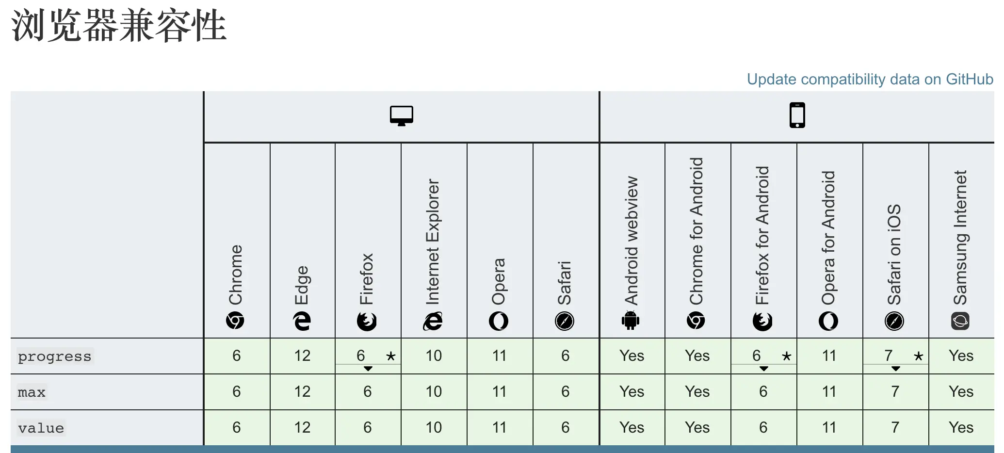 首先我们来看一下<progress>的兼容性,可以发现目前全部主流的浏览器都支持该新标签,但是支持归支持,效果确实另一码事。。。虽然测试的不完全,但是一定程度上也能反映问题(提前说明,测试的浏览器都是当前时间下最新的版本)。