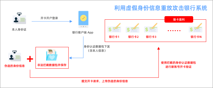 - 最后,田某使用先前拦截的身份认证数据包(含本人信息)进行上传验证,使得银行系统误以为此环节需比对本人身份信息,遂而成功验证本人人脸,使得其能够成功利用虚假身份证信息注册到银行账户。