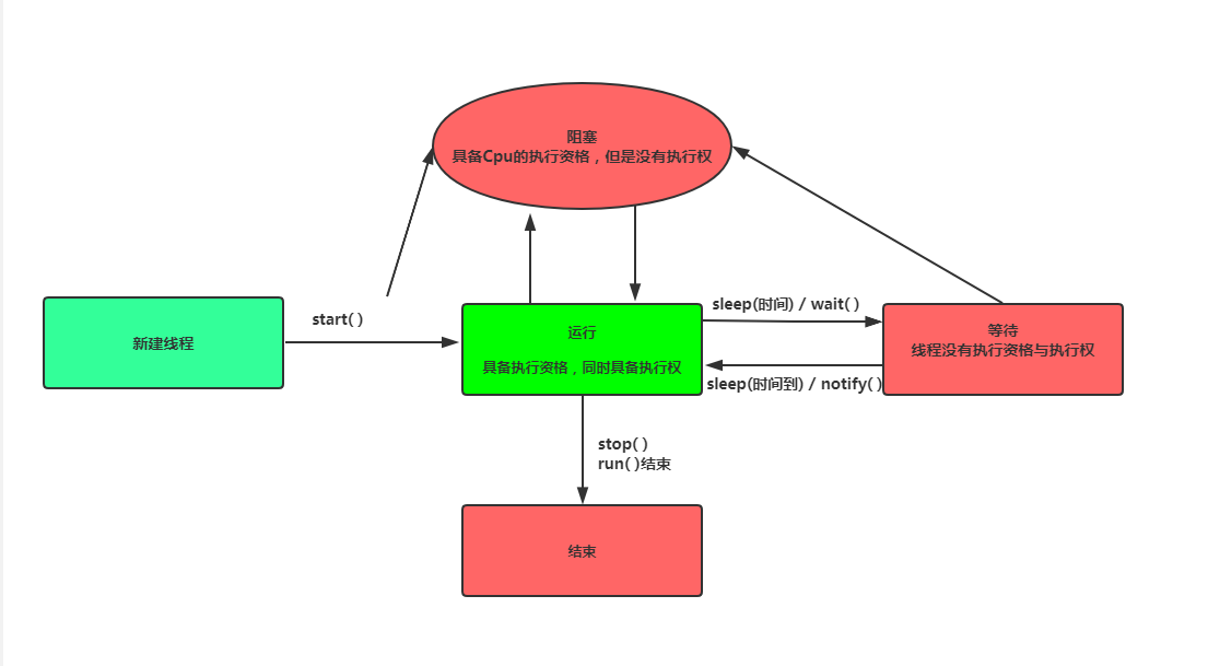 **阻塞状态** :线程在等待着获取一个排他锁,这个事件在另一个线程放弃锁的时候发生;