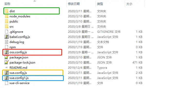上面的图片有两个vue.config.js是为了我自己方便调试,因为如果改成下面的配置的话,npm run serve将无效,这时候每次都要npm run build比较麻烦,也无法实时修改代码看效果。(另外一个js是你之前的vue.config.js)// const webpack = require("webpack"); // const path = require('path'); const oss = require('./oss.config'); // 引入刚刚创建的oss.js文件 const WebpackAliyunOss = require('webpack-aliyun-oss'); console.log(WebpackAliyunOss) module.exports = { devServer: { open: true, hot: true, }, publicPath: 'https://XXX/test/', //publicPath: './', productionSourceMap: false, configureWebpack: config => { let webpackAliyunOss = [ new WebpackAliyunOss({ from: ['./dist/**', '!./dist/**/*.html'], // 上传那个文件或文件夹 可以是字符串或数组 dist: "/test", // 需要上传到oss上的给定文件目录 region: oss.region, accessKeyId: oss.accessKeyId, accessKeySecret: oss.accessKeySecret, bucket: oss.bucket, // test: true, //上面一行,可以在进行测试看上传路径是否正确, 打开后只会显示上传路径并不会真正上传; // 因为文件标识符 "\" 和 "/" 的区别 不进行 setOssPath配置,上传的文件夹就会拼到文件名上, 丢失了文件目录,所以需要对setOssPath 配置。 setOssPath: filePath => { // some operations to filePath let index = filePath.lastIndexOf("dist"); let Path = filePath.substring(index + 4, filePath.length); return Path.replace(/\\/g, "/"); }, setHeaders: filePath => { // some operations to filePath // return false to use default header return { "Cache-Control": "max-age=31536000" }; } }) ]; config.plugins = [...config.plugins, ...webpackAliyunOss ]; } } -