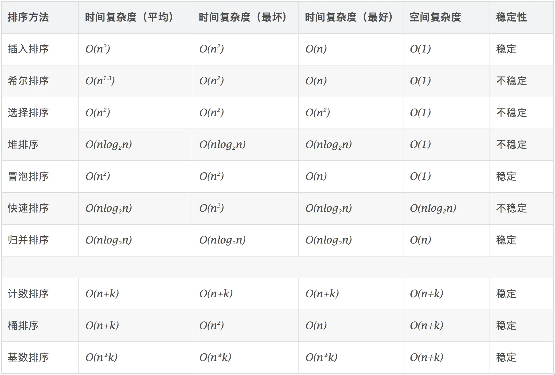 基数排序的空间复杂度为O(n+k),其中k为桶的数量。一般来说n>>k,因此额外空间需要大概n个左右。