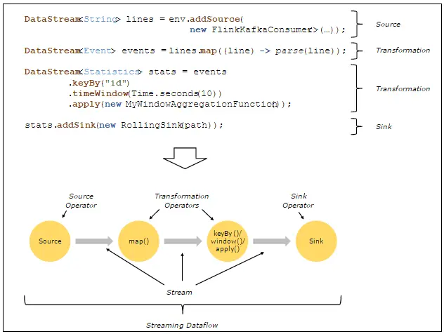 下面是一个由Flink程序映射为Streaming Dataflow的示意图,如下所示:
