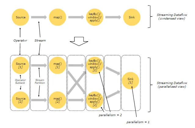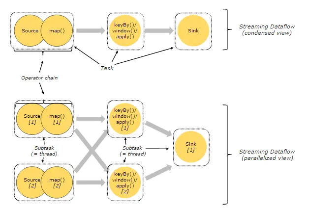 上图中上半部分表示的是一个Operator Chain,多个Operator通过Stream连接,而每个Operator在运行时对应一个Task;图中下半部分是上半部分的一个并行版本,也就是对每一个Task都并行化为多个Subtask。