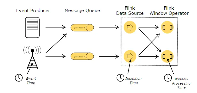 在处理Stream中的记录时,记录中通常会包含各种典型的时间字段,Flink支持多种时间的处理,如下图所示:
