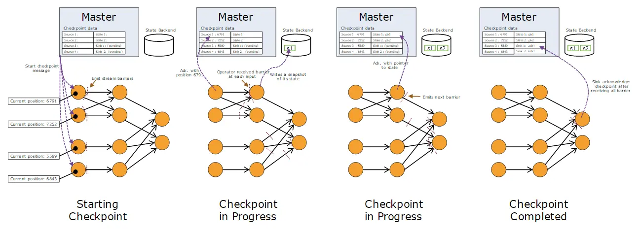 - 来自不同Snapshot多个Barrier可能同时出现在数据流中,也就是说同一个时刻可能并发生成多个Snapshot