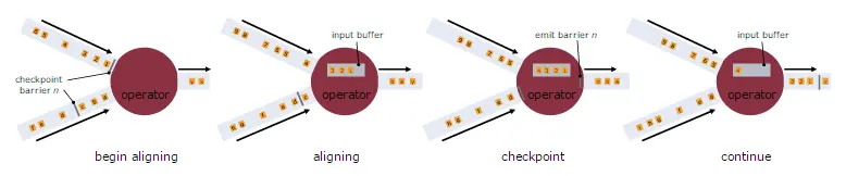 - Operator从一个incoming Stream接收到Snapshot Barrier n,然后暂停处理,直到其它的incoming Stream的Barrier n(否则属于2个Snapshot的记录就混在一起了)到达该Operator