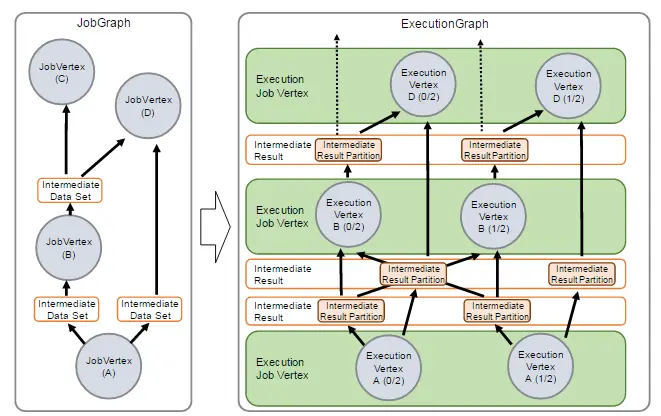 在JobManager端,会接收到Client提交的JobGraph形式的Flink Job,JobManager会将一个JobGraph转换映射为一个ExecutionGraph,如下图所示: