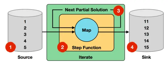上面迭代过程中,输入数据为1到5的数字,Step函数就是一个简单的map函数,会对每个输入的数字进行加1处理,而Next Partial Solution对应于经过map函数处理后的结果,比如第一轮迭代,对输入的数字1加1后结果为2,对输入的数字2加1后结果为3,直到对输入数字5加1后结果为变为6,这些新生成结果数字2~6会作为第二轮迭代的输入。迭代终止条件为进行10轮迭代,则最终的结果为11~15。