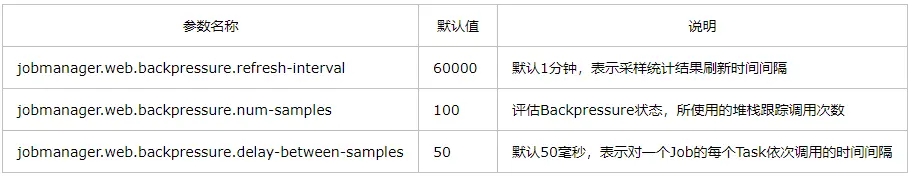 另外,Flink还提供了3个参数来配置Backpressure监控行为: