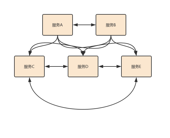 二、摆脱单体系统就远离大泥球?单体系统让很多人诟病的是其服务内聚混乱,看起来就像一个大泥球。那么,服务化之后,就解决了这个问题了吗?事实上,微服务通过拆分单体系统使其成为多个体积更小的服务来降低单个服务的复杂性,让单个系统看起来更加的职能清晰,但是,整个系统架构变得更加复杂。事实上,生产环境的多服务之间的调用可能如图所示的场景。