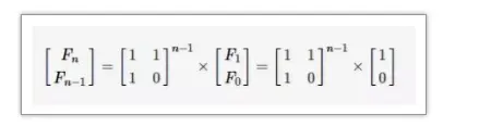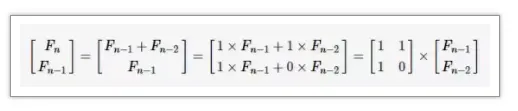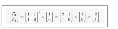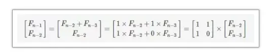 3 《线性代数》是大学计算机专业低年级的课程,这门课教的就是矩阵,那时候觉得这东西学起来很枯燥,没什么用处,工作后你才发现搞机器学习、数据分析、数据建模时大有用处,书到用时方恨少。其实矩阵的本质就是线性方程式。 斐波那契数列中两个相邻的项分别为:F(n) 和 F(n - 1),如果把这两个数当作一个2行1列的矩阵可表示为: 因为 F(n) = F(n-1)+F(n-2),所以就有: 因此想要求出F(n)的值,只要能求出右边矩阵的n-1次方的值,最后求得两矩阵乘积,取新矩阵的第一行的第一列的值即可,比如n=3时: 可以得知F(3)的值2,F(2)的值为1,因为幂运算可以使用二分加速,所以矩阵法的时间复杂度为 O(log n)。 import numpy def fib_matr(n): return (numpy.matrix([[1, 1], [1, 0]]) ** (n - 1) * nu mpy.matrix([[1], [0]]))[0, 0] for i in range(20): print(int(fib_matr(i)), end=" ") >>> 0 1 1 2 3 5 8 13 21 34 55 89 144 233 377 610 987 1597 2584 4181