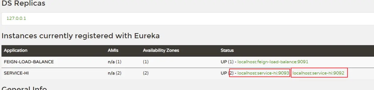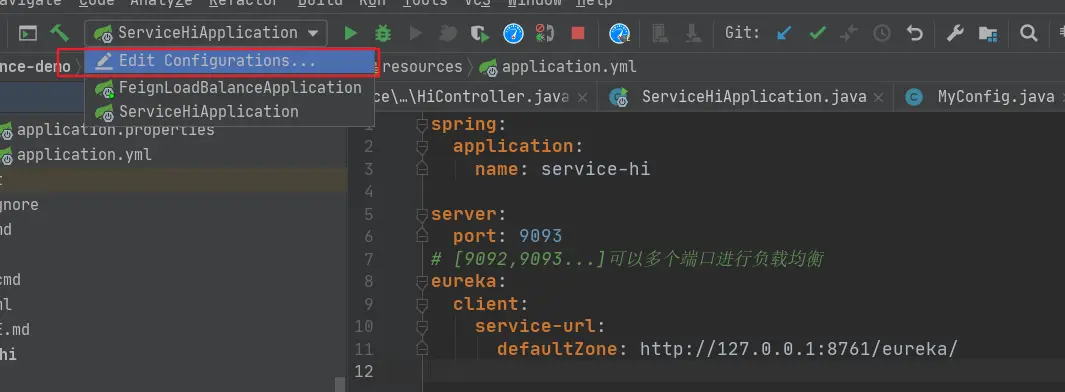其中service-hi在两个端口启动,Feign服务端调用时会负载均衡到不同的服务上