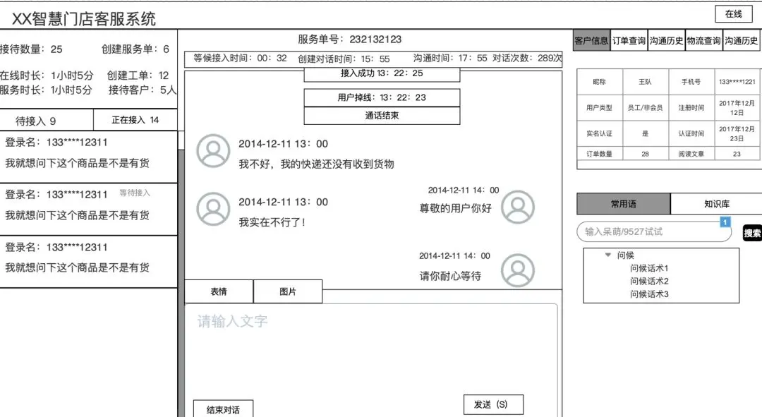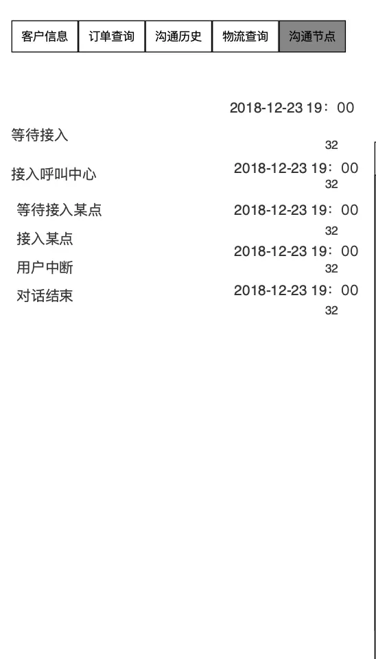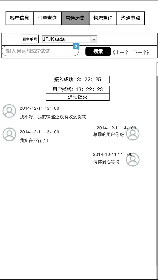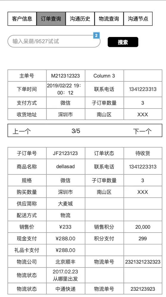 按照我们做的门店客服系统业务下,我们分为客户信息、订单查询、沟通历史(会话记录)、物流查询、沟通节点5个版块。
