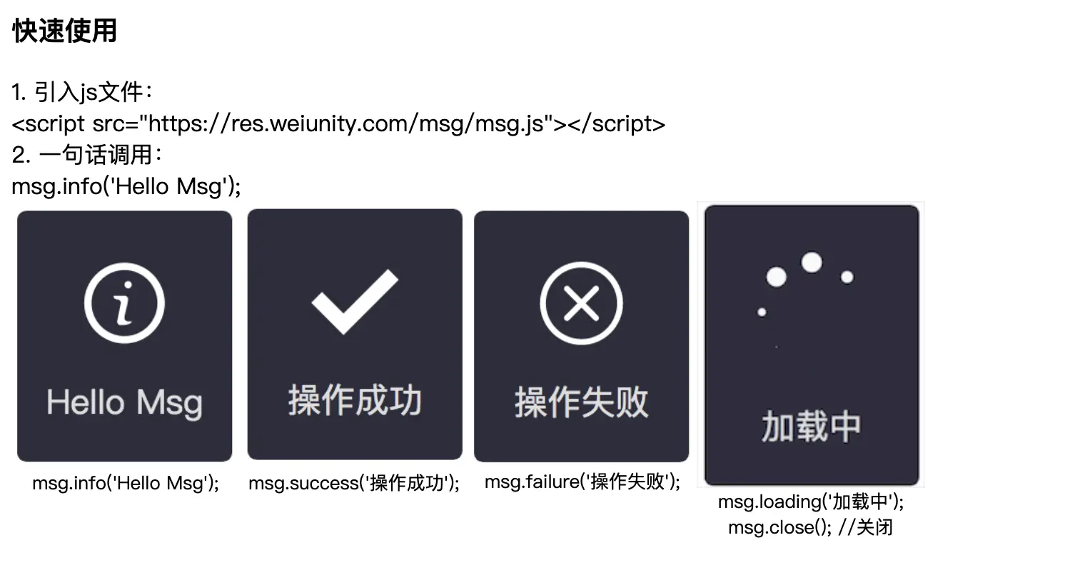 项目简介:msg.js 中包含了加载中、成功提示、失败提示等,引入msg.js,一句调用,不依赖任何第三方 JS 和 CSS。