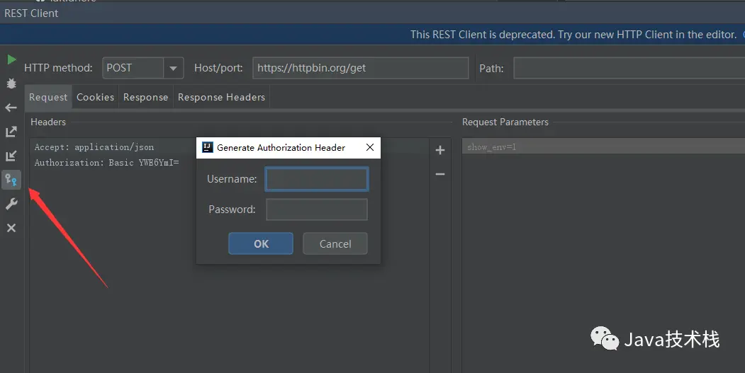 特别说明下的是,如果请求的方式是Authorization :Basic这种方式认证的话,可以点击下图所示的按钮,会弹出填充用户名和密码的窗口出来,填完后会自动补充到Authorization 的header里面去