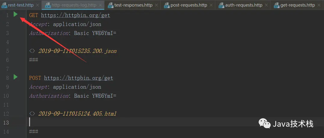 上面的历史记录就是一个完整的IDEA REST Client请求脚本,如果你是从控制台触发的,那么可以直接复制历史请求记录的文件放到项目里作为HTTP请求的脚本,给其他成员共享,如果不是,也可以直接新建一个.http或者.rest结尾的文件,IDEA会自动识别为HTTP请求脚本。