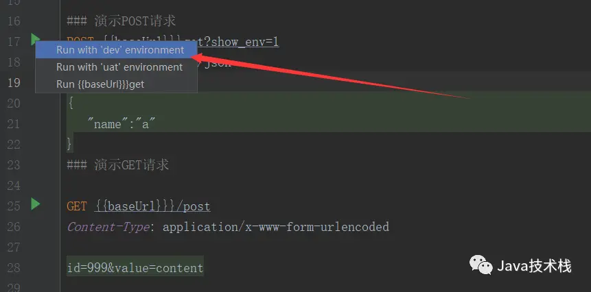 }那么在选择执行请求的时候,IDEA就会让你选执行那个环境的配置,如: