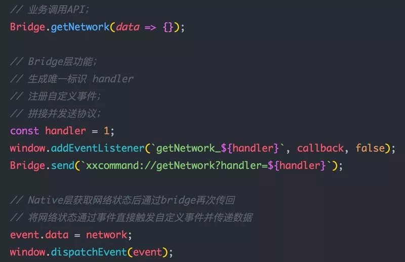 这里有一点需要注意的是,协议的调用,一定是需要确保执行在bridge.js 成功注入后。由于客户端的注入行为属于一个附加的异步行为,从H5方很难去捕捉准确的完成时机,因此这里需要通过客户端监听页面完成后,基于上面的回调机制通知 H5端,页面中即可通过 window.addEventListener('bridgeReady',e=>{})进行初始化。
