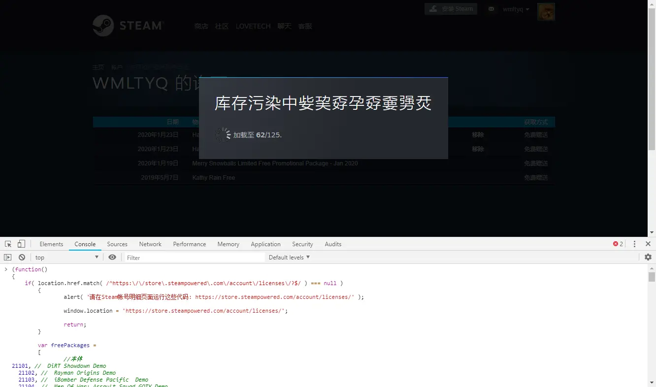 alert('请在Steam帐号明细页面运行这些代码: https://store.steampowered.com/account/licenses/');