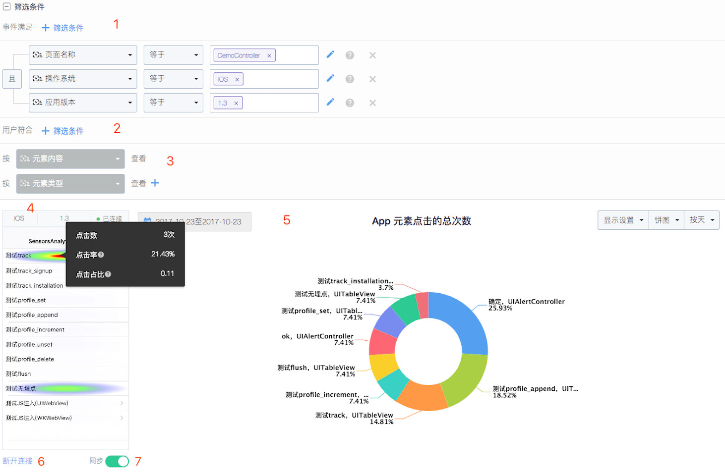 点击图,即应用一种特殊高亮的颜色形式,显示页面或页面组区域中不同元素点击密度的图示。在上图中,清晰展示某个(些)元素被点击的次数和占比,从而帮助使用者直观的判断用户热衷的区域,评估页面设计的科学性。点击图功能依赖于全埋点中的点击事件,因此需要先开启全埋点点击事件的采集。开启点击图后,点击事件会采集控件路径信息属性。
