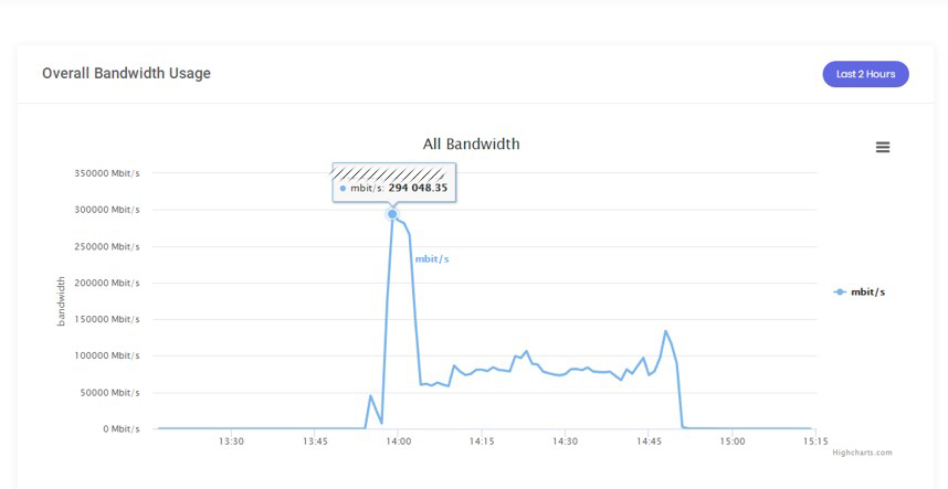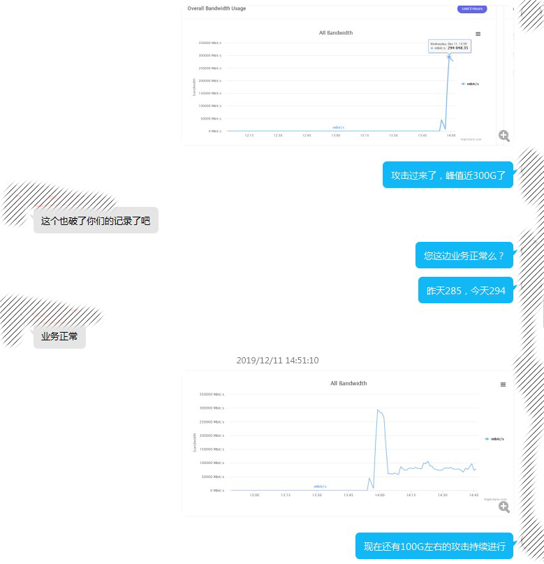 黑客与G先生谈崩以后,恼羞成怒,摈弃之前小规模的试探,在当天下午2点钟左右便开始发动猛烈的攻势。如下图,攻击流量瞬时达到了近300G的峰值!