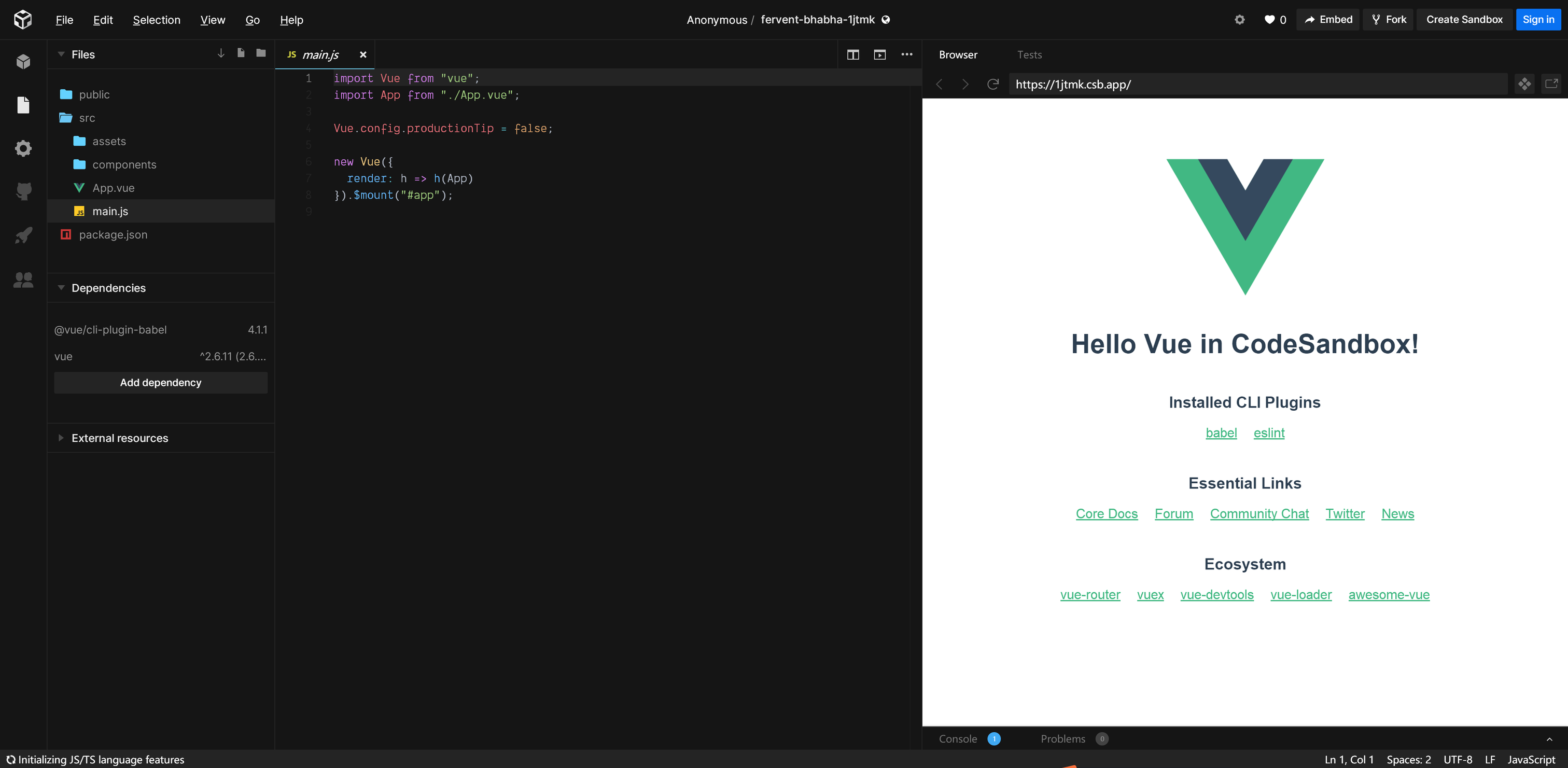 - 如何用 codesandbox.io 写 Vue 代码 登录网站https://codesandbox.io/ 选择Vue
