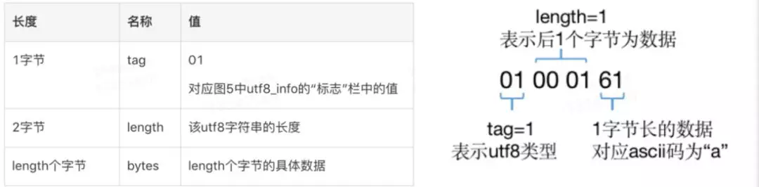 具体以CONSTANT_utf8_info为例,它的结构如下图7左侧所示。首先一个字节“tag”,它的值取自上图6中对应项的Tag,由于它的类型是utf8_info,所以值为“01”。接下来两个字节标识该字符串的长度Length,然后Length个字节为这个字符串具体的值。从图2中的字节码摘取一个cp_info结构,如下图7右侧所示。将它翻译过来后,其含义为:该常量类型为utf8字符串,长度为一字节,数据为“a”。