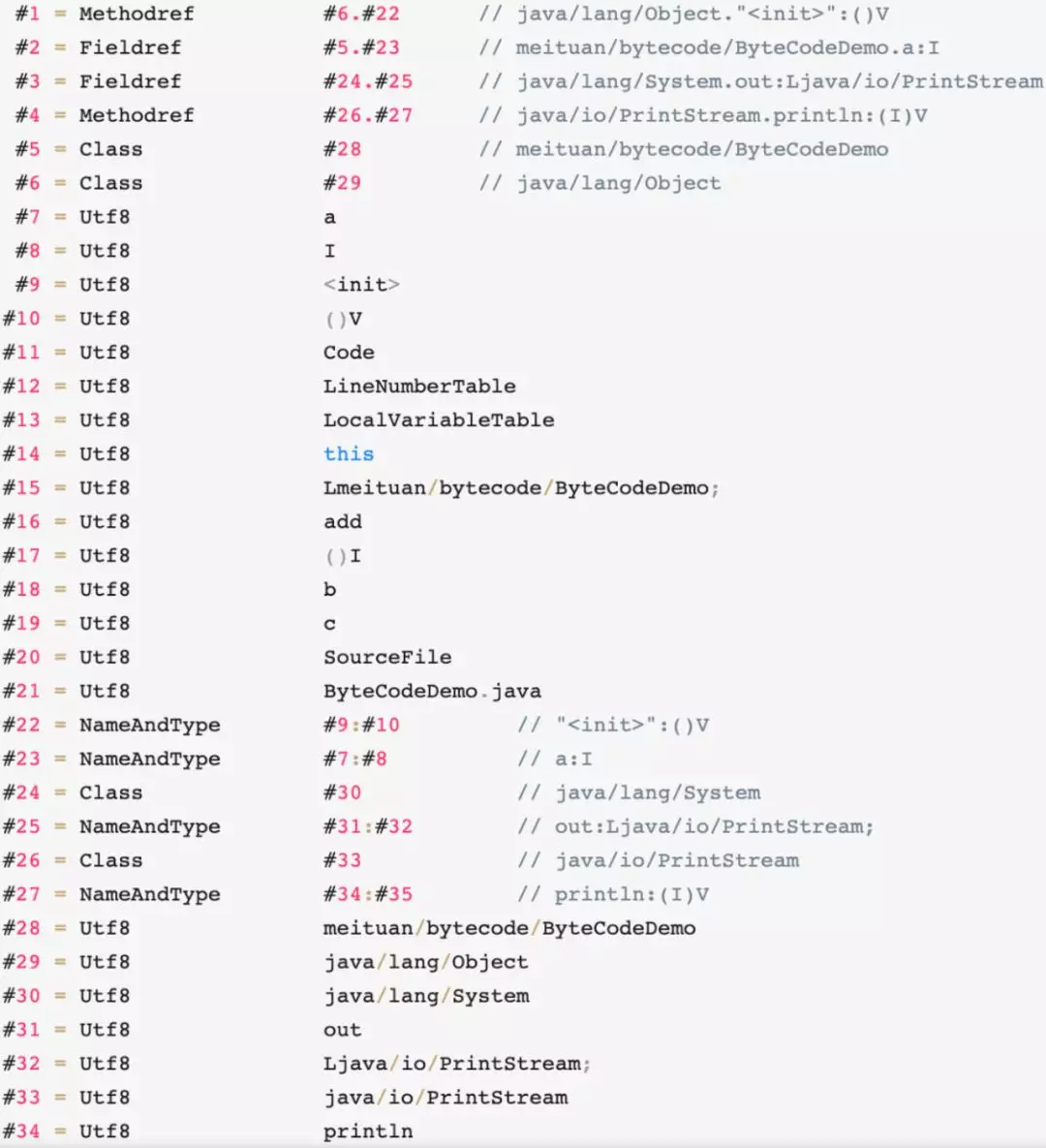 其他类型的cp_info结构在本文不再赘述,整体结构大同小异,都是先通过Tag来标识类型,然后后续n个字节来描述长度和(或)数据。先知其所以然,以后可以通过javap -verbose ByteCodeDemo命令,查看JVM反编译后的完整常量池,如下图8所示。可以看到反编译结果将每一个cp_info结构的类型和值都很明确地呈现了出来。
