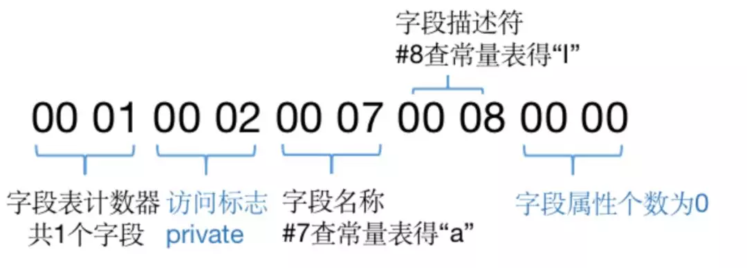 以图2中字节码的字段表为例,如下图11所示。其中字段的访问标志查图9,0002对应为Private。通过索引下标在图8中常量池分别得到字段名为“a”,描述符为“I”(代表int)。综上,就可以唯一确定出一个类中声明的变量private int a。
