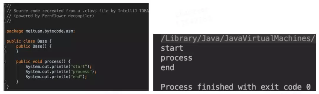 完成这两个Visitor类后,运行Generator中的main方法完成对Base类的字节码增强,增强后的结果可以在编译后的Target文件夹中找到Base.class文件进行查看,可以看到反编译后的代码已经改变了(如图18左侧所示)。然后写一个测试类MyTest,在其中new Base(),并调用base.process()方法,可以看到下图右侧所示的AOP实现效果: